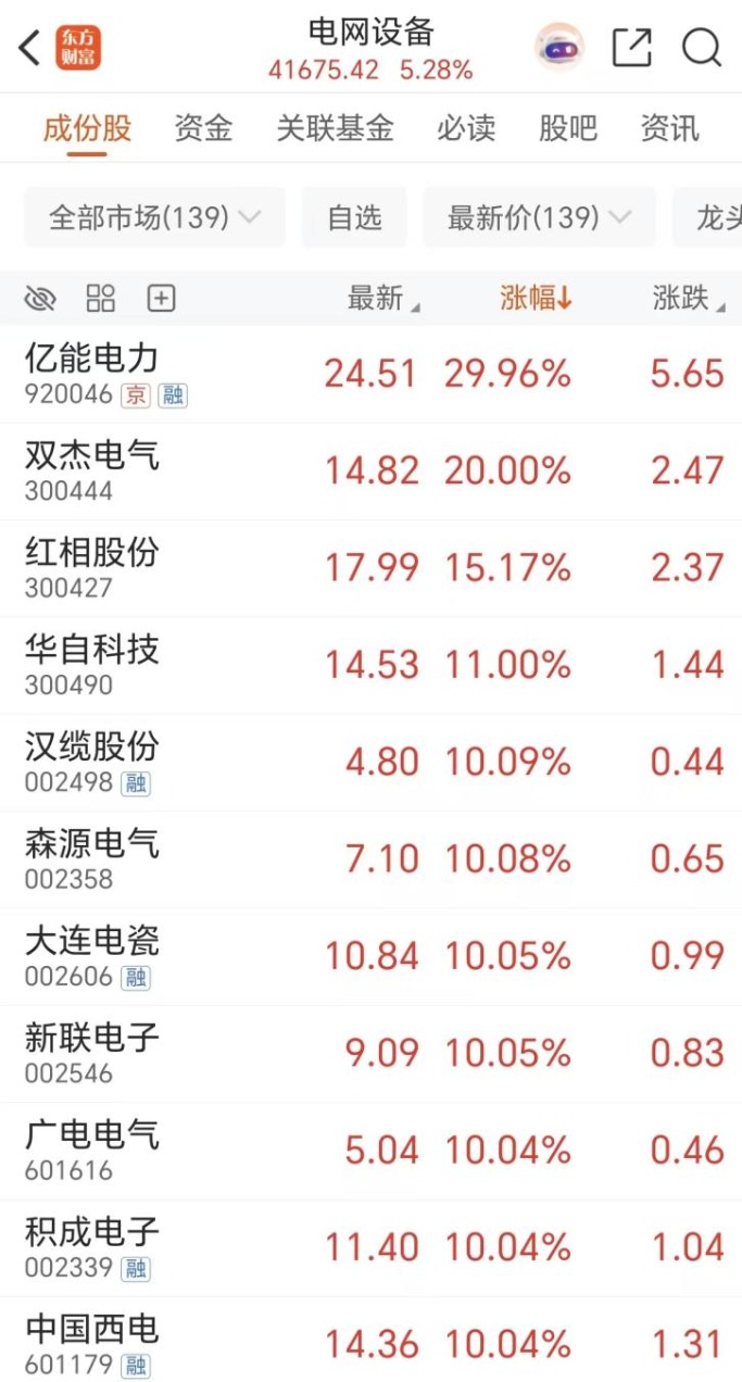 大资金去的另一个方向是电网设备。电网设备股周一延续强势,开盘仅2分钟分时图上就出现几乎垂直的暴拉,收盘涨幅超5%。亿能电力30CM涨停,双杰电气20CM涨停,汉缆股份、森源电气、大连电瓷、广电电气等多股涨停。