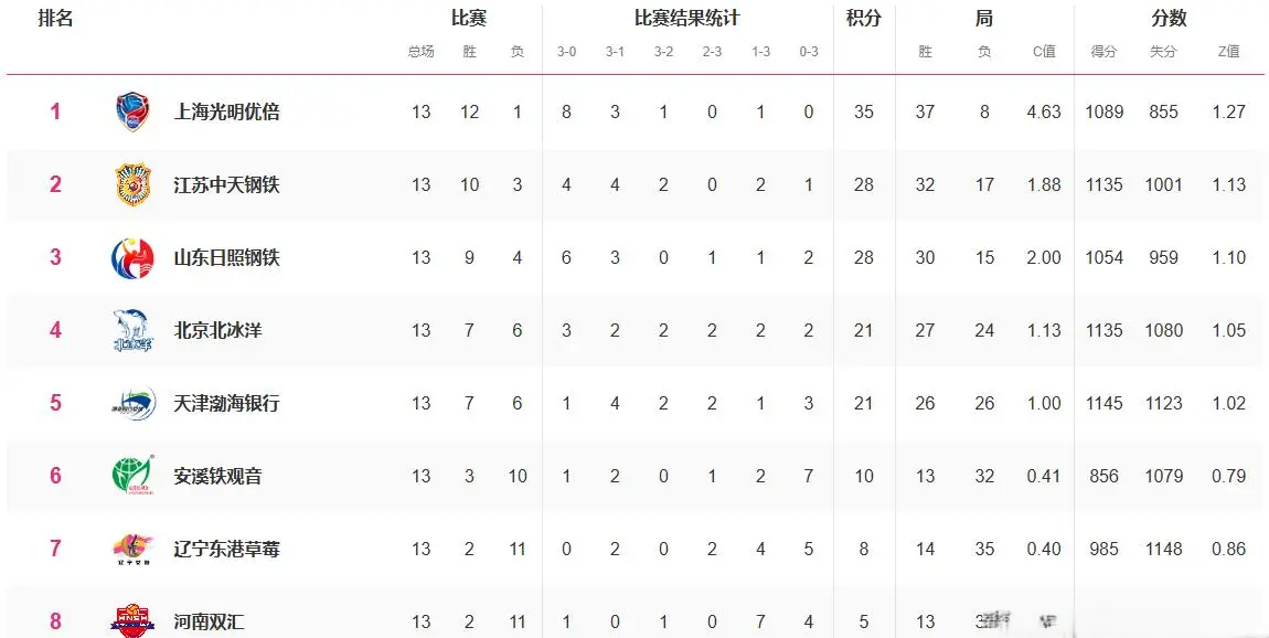 常规赛前十三轮战罢,上海12胜1负积35分提前锁定常规赛冠军。暂居第二的江苏10胜3负积28分。排在第三的山东9胜4负同样积28分。北京和天津同为7胜6负,北京积27分居第四,天津26分排名第五。接下来,3胜10负的福建积10分排名第六,2胜11负积8分的辽宁位列第七,同为2胜11负但仅积5分的河南排名垫底。
