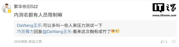 另外一位网友则询问道:“内测名额有人员限制嘛”,王乐则回复道:“可以多叫一些人来压力测试一下”。