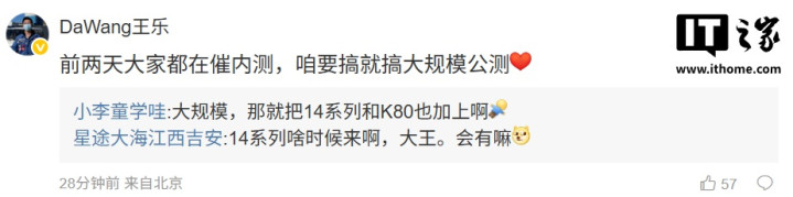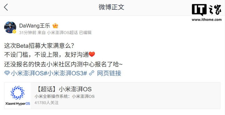 王乐还询问用户对这次Beta招募是否满意,并表示将“友好沟通”,还没报名的同学可以去小米社区App的“内测中心”报名。