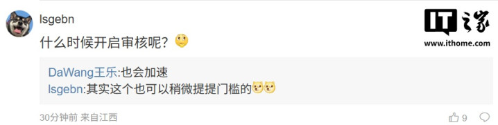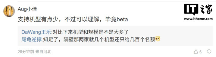 后续有用户在评论区表示:“支持机型有点少,不过可以理解,毕竟Beta”,王乐回复道:“对比下来机型和规模是不是大多了”;另一位用户则询问:“什么时候开启审核呢?[迷惑]”,王乐则表示:“也会加速”。