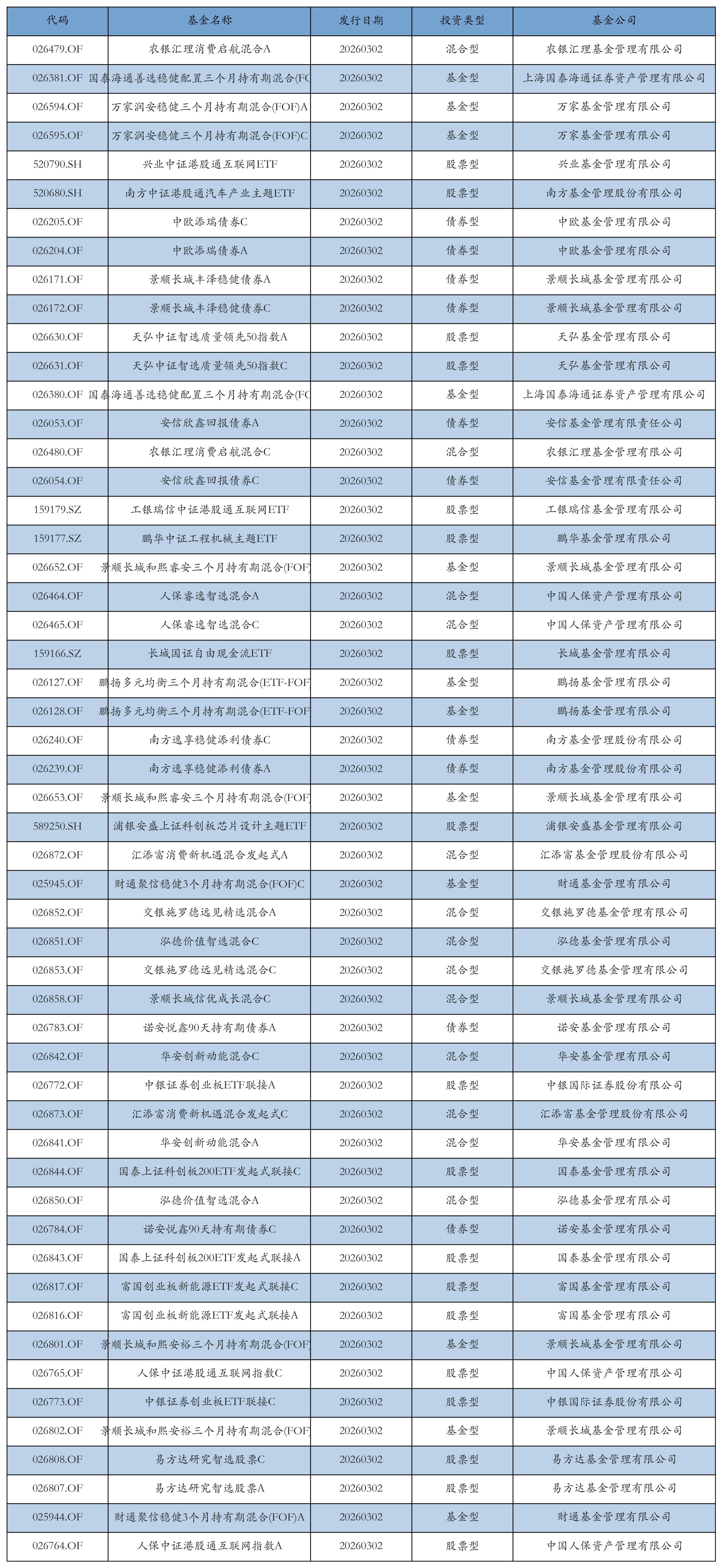 昨日有53只新基金发行,分别为:农银汇理消费启航混合A、国泰海通善选稳健配置三个月持有期混合(FOF)C、万家润安稳健三个月持有期混合(FOF)A、万家润安稳健三个月持有期混合(FOF)C、兴业中证港股通互联网ETF、南方中证港股通汽车产业主题ETF、中欧添瑞债券C、中欧添瑞债券A、景顺长城丰泽稳健债券A、景顺长城丰泽稳健债券C、天弘中证智选质量领先50指数A、天弘中证智选质量领先50指数C、国泰海通善选稳健配置三个月持有期混合(FOF)A、安信欣鑫回报债券A、农银汇理消费启航混合C、安信欣鑫回报债券C、工银瑞信中证港股通互联网ETF、鹏华中证工程机械主题ETF、景顺长城和熙睿安三个月持有期混合(FOF)A、人保睿逸智选混合A、人保睿逸智选混合C、长城国证自由现金流ETF、鹏扬多元均衡三个月持有期混合(ETF-FOF)A、鹏扬多元均衡三个月持有期混合(ETF-FOF)C、南方逸享稳健添利债券C、南方逸享稳健添利债券A、景顺长城和熙睿安三个月持有期混合(FOF)C、浦银安盛上证科创板芯片设计主题ETF、汇添富消费新机遇混合发起式A、财通聚信稳健3个月持有期混合(FOF)C、交银施罗德远见精选混合A、泓德价值智选混合C、交银施罗德远见精选混合C、景顺长城信优成长混合C、诺安悦鑫90天持有期债券A、华安创新动能混合C、中银证券创业板ETF联接A、汇添富消费新机遇混合发起式C、华安创新动能混合A、国泰上证科创板200ETF发起式联接C、泓德价值智选混合A、诺安悦鑫90天持有期债券C、国泰上证科创板200ETF发起式联接A、富国创业板新能源ETF发起式联接C、富国创业板新能源ETF发起式联接A、景顺长城和熙安裕三个月持有期混合(FOF)A、人保中证港股通互联网指数C、中银证券创业板ETF联接C、景顺长城和熙安裕三个月持有期混合(FOF)C、易方达研究智选股票C、易方达研究智选股票A、财通聚信稳健3个月持有期混合(FOF)A、人保中证港股通互联网指数A,详情见下表: