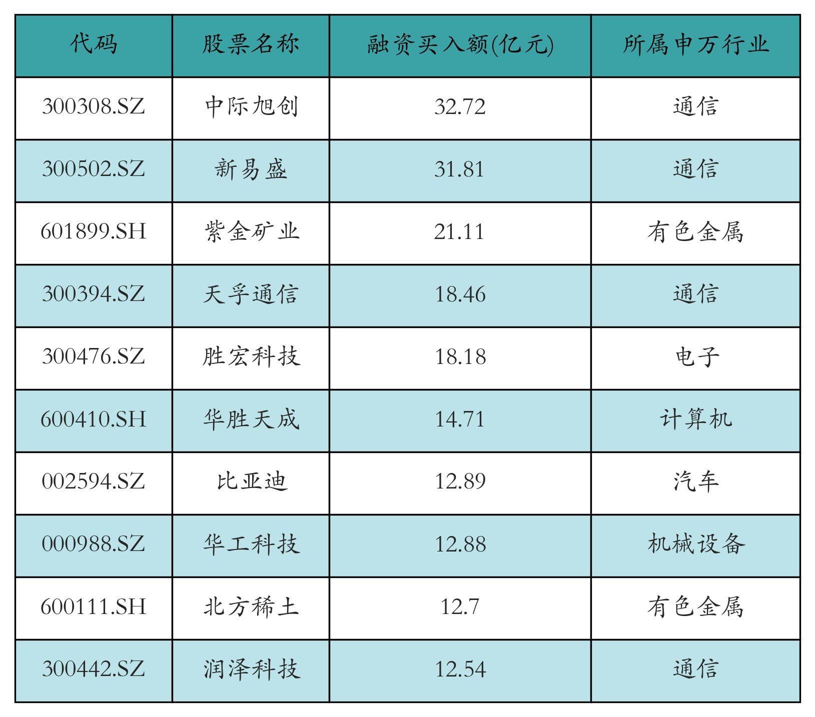 两市共有3482只个股有融资资金买入,其中中际旭创、新易盛、紫金矿业排名前三,买入金额分别32.72亿元、31.81亿元、21.11亿元。融资买入额前10个股详情见下表: