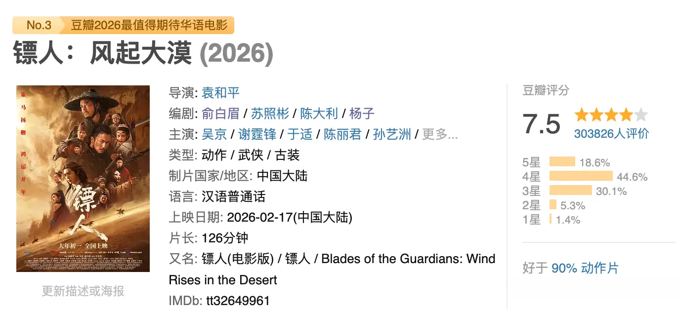 说到底,是武侠的天花板摆在那儿,十年没挪过。《师父》亏过,《绣春刀2》亏过,去年的《射雕》也没打出水花。观众进电影院要么图热闹要么带孩子,武侠那种要沉进去品的气质,放在春节档本来就有点错位。