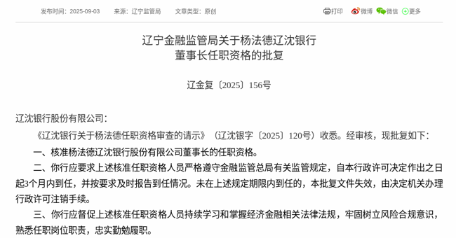 25年09月03日,根据国家金融监督管理总局消息,《辽沈银行关于杨法德任职资格审查的请示》获得通过专业股票配资公司,批复杨法德辽沈银行股份有限公司董事长的任职资格。