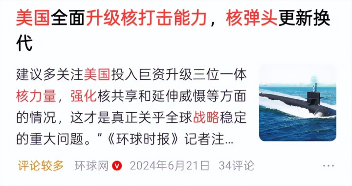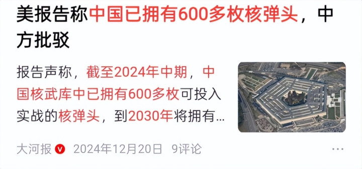 参考信息: 1、新浪财经:美加快核武更新威胁全球安全 2、中国新闻网:习言道|提升战略威慑和实战能力 3、大河报:美报告称中国已拥有600多枚核弹头,中方批驳 4、环球网:美国全面升级核打击能力,核弹头更新换代